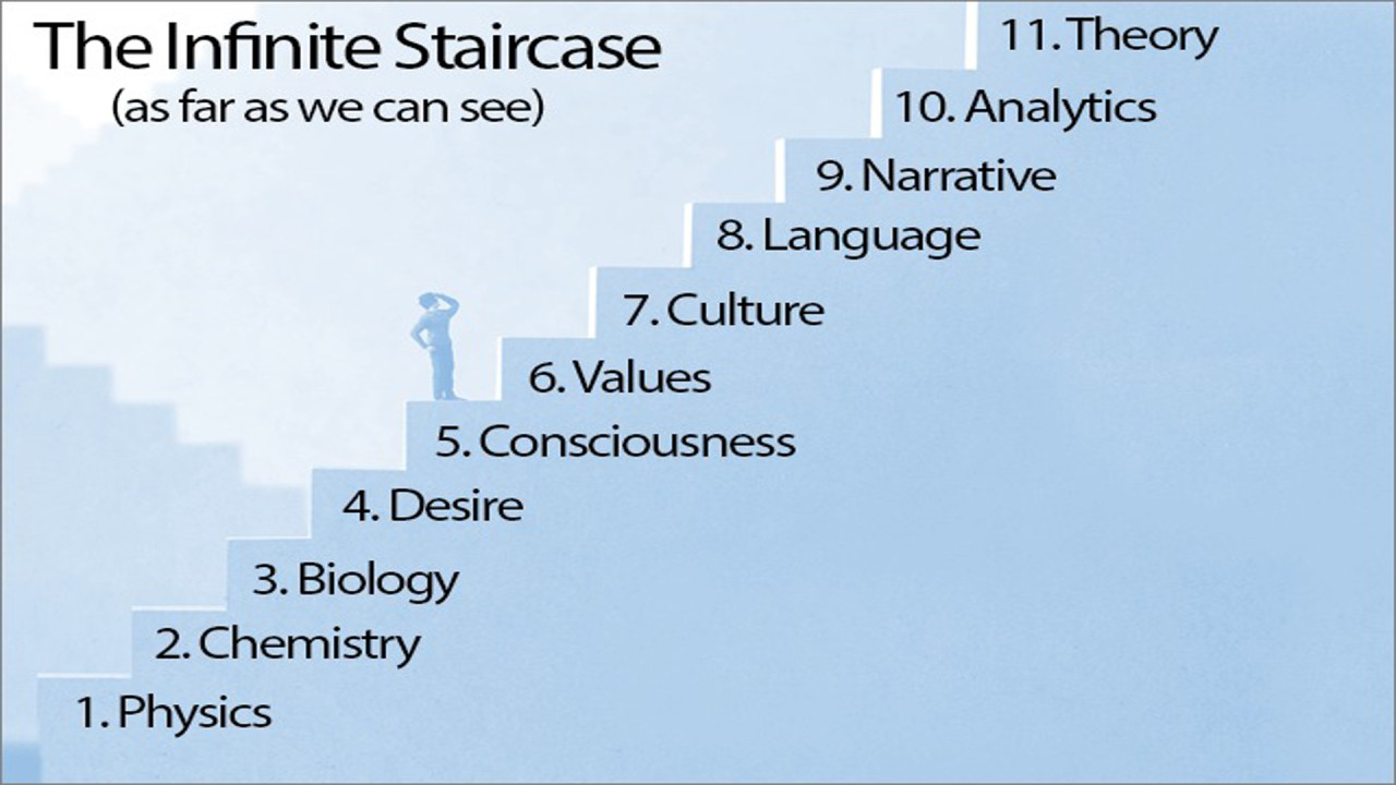 Readers of The Infinite Staircase (who are not many but whom I highly esteem) will know that it describes reality as constituted not of two but rather of eleven separate levels. At the bottom of the staircase is physics, all matter, no mind. At the top is theory, all mind, no matter. But there are nine layers in between, and here is the amazing thing. Each one is not only distinctly separable from the one above and below it, it is also defined by what I will call a characteristic attribute.